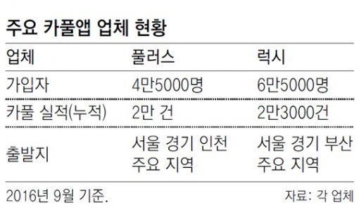 카풀앱은 자가용 차량 소유주와 출발지 및 목적지가 같은 다른 사람을 연결시켜 주는 스마트폰 애플리케이션(앱)이다. 카풀을 중간에서 연결해 주는 서비스다. 고객이 앱에 등록한 신용카드로 운행요금을 결제하는 방식으로 운영된다. 차량 소유주가 요금을 받고, 앱을 운영하는 사업자는 수수료를 받는다. 올 상반기 ‘풀러스’ ‘럭시’ 등 비슷한 앱이 속속 등장하고 있다. 주로 성남시 일대에서 시작돼 서서히 인기를 끌면서 지금은 서울 경기 전역과 부산 일부 지역에서도 운영 중이다.