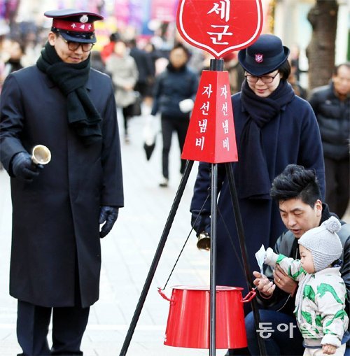 구세군 모금활동이 시작된 1일 서울 중구 명동 거리에서 어린아이가 자선냄비에 지폐를 넣고 있다.
