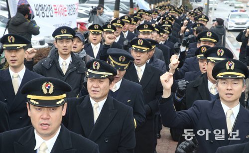 대한항공조종사노동조합이 부분파업에 돌입한 22일 서울 강서구 대한항공 본사 앞에서 제복을 입은 노조 소속 조종사들이 ‘2016년 임금협상 승리를 위한 파업출정식’을 열었다. 파업 참여 인원이 적고 규모도 제한적인 터라 이날 여행객들의 큰 혼란은 없었으나 국토교통부는 여객안전 상황을 주시하며 만일의 사태에 대비했다.