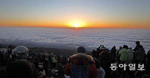 정유년 첫 해맞이를 위해 1일 제주 한라산 정상(해발 1950m)을 찾은 사람들이 구름 위로 떠오르는 태양을 바라보고 있다. 이날 맑은 날씨 속에 바람도 잠잠해 한라산을 찾은 등산객 8000여 명은 눈부신 일출을 감상할 수 있었다.
