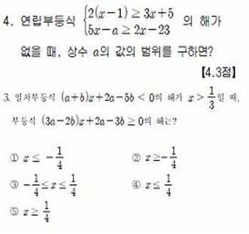 지난해 서울 강남구 A중학교 2학년 1학기 수학 기말고사 문제다. 수학 교사들은 “문제를 이해하고 식을 세워 푸는 과정이 복잡하고 시간도 오래 걸리는 문제”라며 “미지수를 정하는 방법과 의미 없는 값에 대한 판단, 비율에 대한 개념을 모두 잘 다룰 수 있어야 해결할 수 있는 극상(極上) 난이도의 문제”라고 말했다.