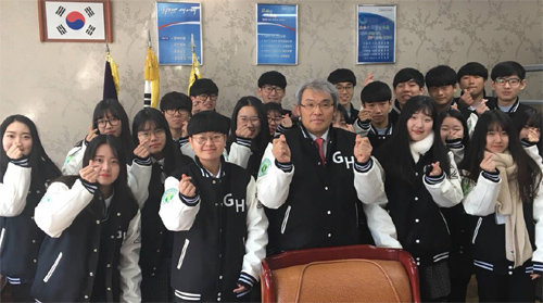 김화고 원성용 교장(가운데)이 최근 학생자치회 학생들과 학교 점퍼를 입고 손가락으로 하트 모양을 만들며 미소를 짓고 있다. 김화고 제공