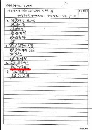 정유라 씨의 이름으로 된 이화여대 시험 답안지가 공개돼 대리시험의혹이 일고있는 가운데, 공개된 문제의 시험 답안지 중 뜻을 알수 없는 단어에 정답처리가 돼 있어 눈길을 끈다.