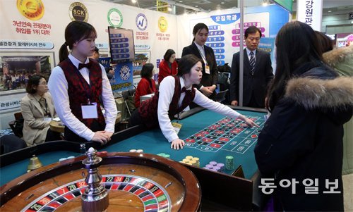 4일 서울 강남구 코엑스에서 열린 ‘2017학년도 정시 전문대학 입학정보 박람회’에서 수험생들이 카지노학과 부스에서 게임장 딜러에 대한 설명을 듣고 있다. 65개 전문대가 참가한 이번 박람회는 6일까지 열린다.