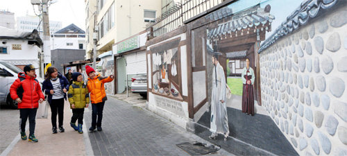 최근 대구 중구 영남대로를 찾은 어린이들이 조선시대 집을 나서는 선비와 배웅하는 부인의 모습을 나타낸 트릭아트(착시 그림)를 보며 걷고 있다. 대구 중구 제공