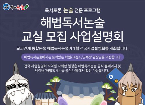 ㈜해법에듀의 교과연계 통합논술 브랜드 ‘해법독서논술’에서 학원·교습소·공부방 예비 창업자를 대상으로 전국 사업설명회를 연다.