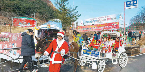 산으로 둘러싸여 오지로 불리던 분천역이 ‘산타마을’로 바뀐 뒤 관광객이 크게 늘고 있다. 봉화군청에서 승용차로 굽이굽이 산길을 넘어 40분 이상 달려야 도착하는 이곳은 3년 전까지 이용객이 하루 10명 정도였다. 지금은 사정이 바뀌었다. 2014년 12월 20일 산타마을이 문을 열면서 하루 2000여 명의 관광객이 찾는 명소로 바뀌었다. 지난해 12월 문화체육관광부와 한국관광공사의 ‘한국 관광의 별’에 선정됐다.
