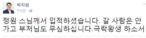 박 전 원내대표는 10일 페이스북에 "정원 스님께서 입적하셨습니다. 갈 사람은 안 가고 부처님도 무심하십니다.극락왕생 하소서"라고 글을 올렸다.
