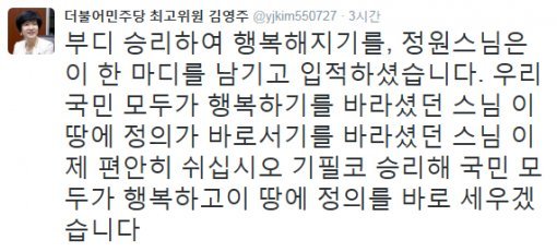 김 최고위원은 10일 자신의 트위터에 “부디 승리하여 행복해지기를, 정원스님은 이 한 마디를 남기고 입적하셨다”는 글과 함께 이 같은 말을 전했다.