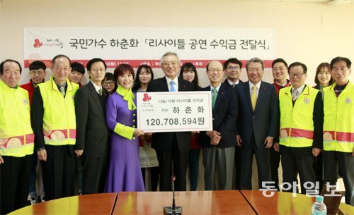 부산 출신 국민가수 하춘화 씨가 10일 부산MBC 회의실에서 공연 수익금 1억2000여만 원을 부산사회복지공동모금회에 전달하고 있다.