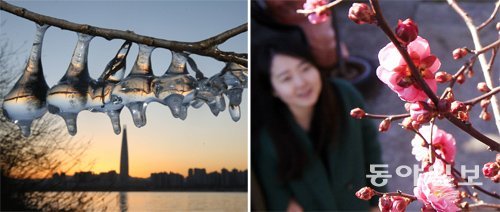 올겨울 가장 매서운 한파가 대한민국을 꽁꽁 얼린 11일 서울 광진구 한강 뚝섬유원지에 고드름이 주렁주렁 매달려 있다(왼쪽 사진). 이날 서울 아침 최저기온이 올겨울 들어 가장 낮은 영하 8도를 기록한 것을 비롯해 제주도를 제외한 전국 대부분이 영하권에 들었다. 전남 광양군 매화마을에는 연분홍 홍매화가 때 이른 개화로 행인들의 눈길을 끌었다.