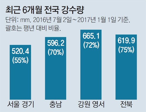 11일 기상청에 따르면 최근 6개월(7월 2일∼1월 1일) 서울·경기 지역 강수량은 520.4mm로 평년 대비 55% 수준에 그치고 있다. 특히 오산 지역은 40%에 머물렀다. 충남 지역은 596.2mm(평년 대비 70%), 강원 영서는 665.1mm(평년 대비 72%), 전북은 619.9mm(평년 대비 75%) 수준이다.