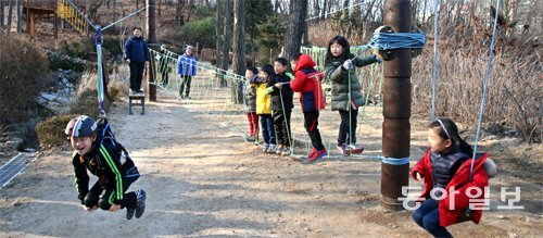 하지만 아이들의 표정은 훨씬 밝았다. 울퉁불퉁하고 넓은 언덕배기 자체가 최고의 놀이터였다. 경사진 길이 많아 뛰다가 넘어지기 일쑤였지만 낙엽 깔린 흙길이어서 다치는 아이는 거의 없었다. 나무 위의 집을 본떠 만든 ‘트리하우스’도 인기가 좋았다. 밧줄을 잡고 오르내리는 경사대는 꽤나 가팔랐고 구름다리는 흔들거렸지만 아이들은 더 신나했다. 한 남자아이는 장난삼아 “난 죽는다!” 하며 높이가 1m 정도 되는 하우스 문간에서 뛰어내렸다. 말과는 달리 바닥에 안전하게 착지하자 친구들을 향해 자랑스럽게 손을 흔들어 보였다.