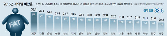 직장 가입자의 경우 직장의 규모가 작을수록 비만율이 높았고, 지역별로는 제주(36.1%) 강원(35.4%) 충남(34.6%) 등 농어촌 지역의 비만율이 대구(30.2%) 광주(31.0%) 서울(31.8%) 등 도시 지역보다 높았다.