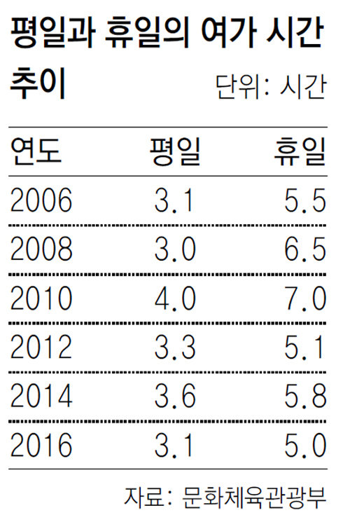 12일 문화체육관광부가 발표한 ‘2016 국민여가활동조사’에 따르면 지난해 국민 평일 여가시간은 평균 3.1시간, 휴일 여가시간은 5.0시간이었다. 10년 전인 2006년과 비교하면 평일 여가시간은 같지만 휴일 여가시간은 30분 줄었다. 직전 조사인 2014년(각각 3.6시간, 5.8시간)보다는 모두 감소했다.