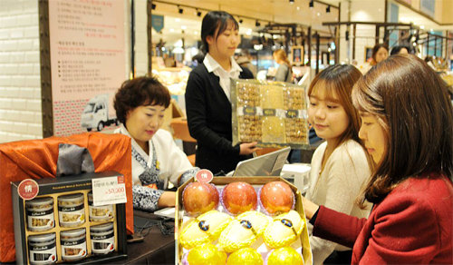 롯데백화점 대구점 지하2층 식품관에서 고객이 설 과일 선물 택배를 접수하고 있다. 설 선물 택배센터는 24일까지 운영된다.