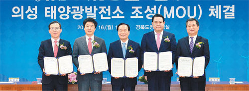 경북도와 의성군, 청암에너지, 미래에셋대우, 한화큐셀은 16일 경북도청에서 의성군에 태양광발전소를 건립하는 투자 협약을 체결했다.