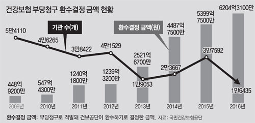최근에는 의사 명의만 빌린 ‘사무장병원’의 부당청구 적발건수가 크게 늘었다. 2009년 9억6000만 원이던 사무장병원의 부당청구 환수결정 금액은 지난해 5675억2200만 원으로 급증했다. 전체 부당청구 환수결정 금액도 2013년 2521억 원, 2014년 4487억 원, 2015년 5399억 원으로 크게 늘었다.