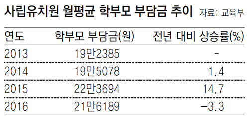 교육부는 이런 내용의 ‘2017년 사립유치원 납입금 안정화 방안’을 추진한다고 16일 밝혔다. 정부의 재정 지원이 이뤄지고 있지만 일부 사립유치원이 원비를 높게 책정해 학부모들이 여전히 유치원 교육에 큰 부담을 느끼기 때문이다.