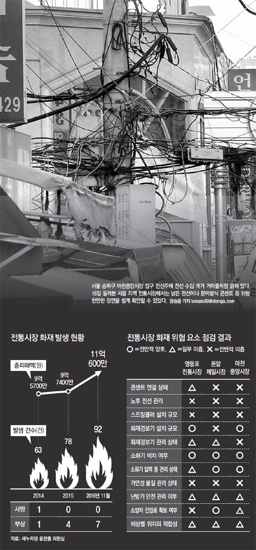 마천중앙시장에 있는 한 반찬가게에서는 국이 끓는 커다란 솥 옆의 기둥에 전선들이 덩굴처럼 어지럽게 얽혀 있었다. 전선 몇 개는 아예 피복이 벗겨져 있었다. 주인 이모 씨(59·여)는 “10년째 같은 전선을 썼지만 아직 불이 난 적은 없다”면서도 “그래도 다른 시장에 불이 났다는 뉴스를 볼 때마다 겁이 나곤 한다”고 말했다.