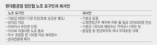 현대중공업 노사는 설연휴 전까지 임단협이 타결되지 않으면 ‘강대강’ 대립이 한층 강화될 것으로 보인다. 노조는 임금 9만6712원 인상, 사외이사 추천권, 연 100명 이상 해외연수 등을 요구하고 있다. 반면 회사는 기본급 동결, 고정연장근무 폐지에 따른 임금 보전을 위해 월평균 임금 3만9000원 인상 등의 안을 내놓으며 평행선을 달리고 있다.