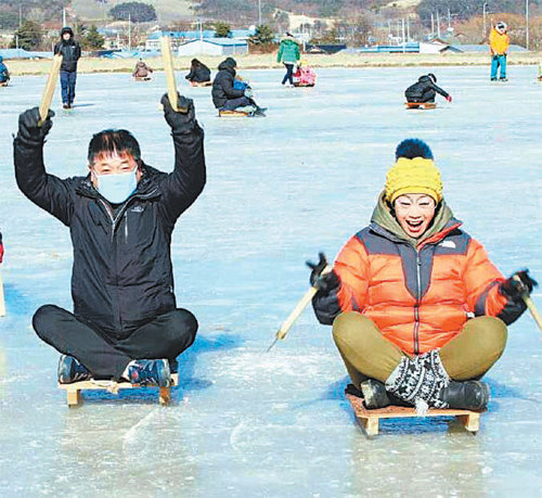 경북 포항시 죽장면 상옥리 논 썰매장에서 관광객들이 썰매를 즐기고 있다. 다음 달 초까지 무료로 운영한다. 썰매 대여료는 하루 5000원이다.