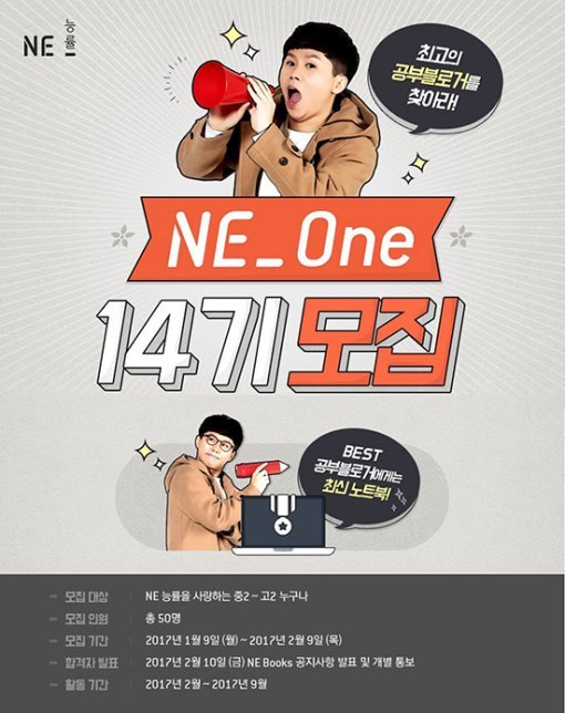 한편 NE 능률은 청소년 서포터즈 NE One 14기 모집에 대한 페이스북 공유 이벤트도 진행 중이다. NE 능률공식 페이스북에 게시된 NE One 모집글을 공유하면 추첨을 통해 카카오 프렌즈 세트(5만 원 상당) 또는 던킨도너츠(3천 원 상당) 기프티콘을 증정한다. NE One 14기 모집에 대한 자세한 사항은 NE Books 홈페이지에서 확인할 수 있다.