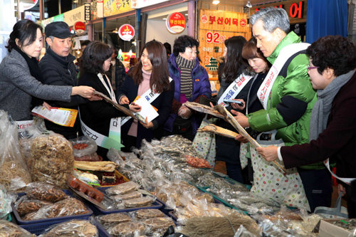 대구 달서구 직원들이 감삼동 서남신시장 건어물 가게에서 물건을 고르고 있다. 달서구는 26일까지 설맞이 장보기 행사를 한다.