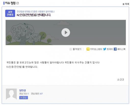 23일 오후 다음 아고라 이슈 청원에는 "KC인증을 반대합니다. 많은 사람들이 알아야합니다 국민들의 의식주는 건들지 맙시다" 라는 청원이 올라왔다.