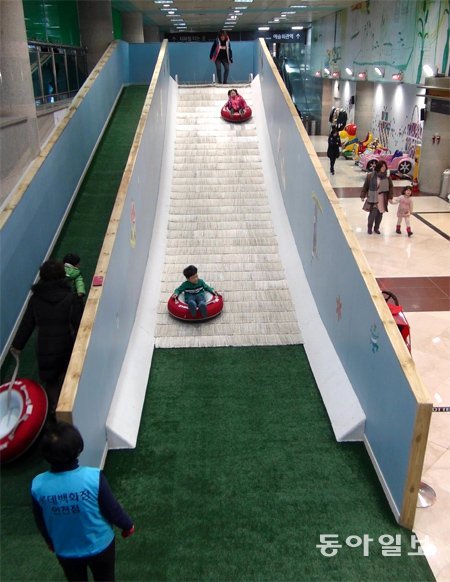강추위에 실내 썰매장이 인기다. 인천 남동구 구월동 롯데백화점은 인천지하철 1호선 예술회관역과 이어지는 공간에 썰매장을 만들어 다음 달 말까지 무료로 개장한다.