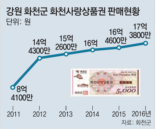 행정자치부는 24일 화천군을 지역사랑상품권 모범 사례 중 하나로 꼽고 상품권 발행을 원하는 다른 지자체를 상대로 컨설팅을 시작했다고 밝혔다. 행자부 관계자는 “축제를 즐기러 방문하는 관광객의 지역 내 소비를 자연스럽게 유발해 풀뿌리 경제 활성화에 큰 도움이 된다”고 설명했다.