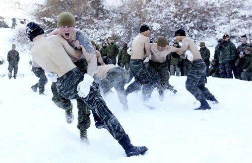 한미 해병대원들이 24일 강원 평창군 황병산에 위치한 해병대 산악종합훈련장에서 상의를 벗은 채 참호 격투를 하고 있다. 영하 30도를 넘나드는 혹한 속에서 15일부터 진행 중인 이번 동계 전술훈련은 다음 달 3일까지 이어진다.