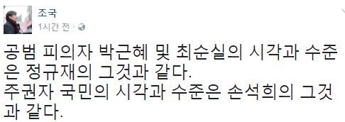 조 교수는 26일 페이스북에 "공범 피의자 박근혜 및 최순실의 시각과 수준은 정규재의 그것과 같다. 주권자 국민의 시각과 수준은 손석희의 그것과 같다"고 글을 올렸다.