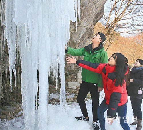 30일 전북 순창군 강천사 계곡에 한파가 만든 높이 5m가 넘는 커다란 얼음 빙벽이 겨울 정취를 즐기려는 관광객들의 발길을 붙잡고 있다.