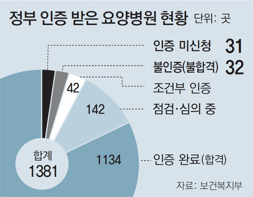 30일 보건복지부에 따르면 지난해 12월까지 전국 요양병원 1381곳 중 불합격에 해당하는 불인증 판정을 받았거나 인증을 신청조차 하지 않은 병원은 각각 32곳(2.3%), 31곳(2.2%)이었다. 환자 사이의 감염을 막기 위한 기초 위생수칙을 지키지도, 2014년 22명이 숨진 전남 장성군 요양병원 화재 같은 안전사고를 막기 위한 안전시설을 갖추지도 않은 ‘불량 요양병원’이 전국에 63곳이 있는 셈이다.