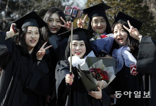 14일 서울 마포구 서강대에서 열린 2016학년도 전기 졸업식에서 학사모와 학사복을 차려입은 졸업생들이 휴대전화 셀카봉을 들고 환한 미소로 기념사진을 찍고 있다. 이날 서강대는 학부생 1198명과 대학원생 600여 명에게 학위를 수여했다.