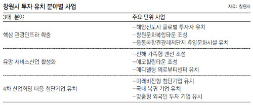 4차 산업혁명에 대응할 첨단 기업 유치 분야는 첨단 우량 기업, 외국인 투자 기업과 국내 유턴 기업 유치, 기업 역외 이전 방지, 조선기자재사업 다각화를 역점 시책으로 정했다. 첨단 우량 기업은 창원산업단지 확장 구역과 옛 육군대학 터, 현재 조성하는 일반산업단지 등에 유치한다. 외국인 투자 기업을 끌어들이기 위해 국제투자유치자문관, 해외 자매도시, KOTRA 등을 활용한다는 방침이다. ‘집토끼’인 지역 기업이 창원 밖으로 옮기는 것을 최대한 차단하기 위한 시책도 추진한다. 정 부시장은 “지속 가능한 도시 성장의 기틀을 마련하기 위해 선택과 집중으로 최상의 성과를 창출하도록 힘을 쏟겠다”고 말했다. 투자 문의 055-225-2654