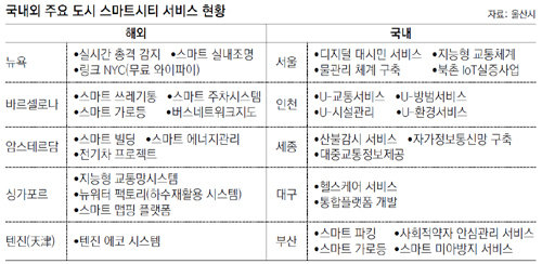이 밖에 울산의 특성에 맞게 6개 분야, 28개 스마트시티 서비스 모델을 발굴하기로 했다. 통합관제센터로 사용될 울산 스마트시티센터는 울산시청 구 청사 남쪽에 지하 2층, 지상 5층 규모로 내년 3월 완공 예정이다. 울산시 관계자는 “스마트시티가 구축되면 새 일자리가 창출되고 울산 특화산업의 경쟁력이 강화되는 것은 물론 다양한 도시 문제를 해결해 도시 기능의 효율성과 시민 생활의 편리함도 한결 커질 것”이라고 말했다.