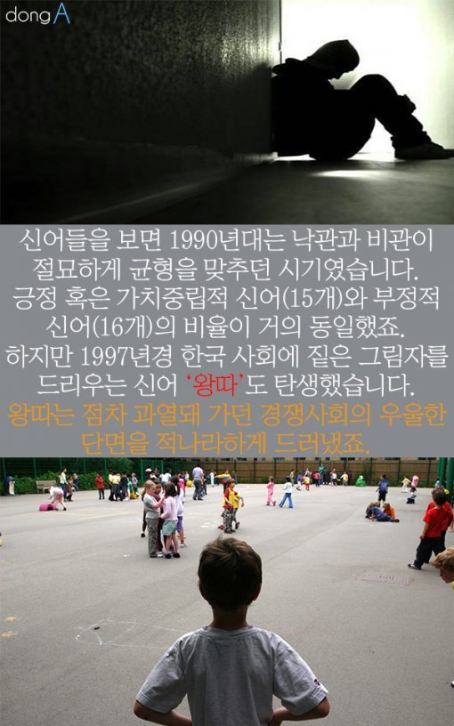 #5. 신어들을 보면 1990년대는 낙관과 비관이 절묘하게 균형을 맞추던 시기였습니다. 긍정 혹은 가치중립적 신어(15개)와 부정적 신어(16개)의 비율이 거의 동일했죠. 하지만 1997년경 한국 사회에 짙은 그림자를 드리우는 신어 ‘왕따’도 탄생했습니다. 왕따는 점차 과열돼 가던 경쟁사회의 우울한 단면을 적나라하게 드러냈죠.