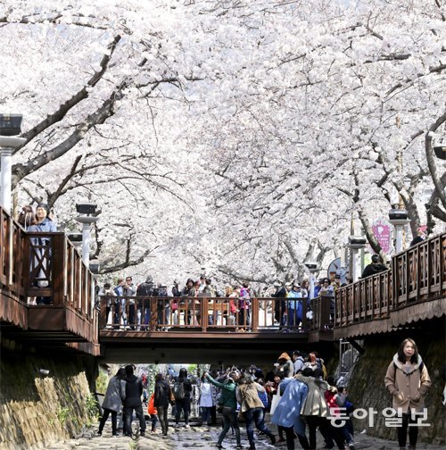 진해 군항제가 열린 지 이틀째인 2일 경남 창원시 진해구 여좌천이 활짝 핀 벚꽃을 감상하려는 시민들로 북적이고 있다. 3일 낮 최고기온은 서울 부산 19도, 광주 청주 20도, 대전 대구 21도로 포근하겠지만 일교차가 10도 이상으로 크게 벌어지고 새벽에는 안개 끼는 곳이 많아 주의가 필요하다.