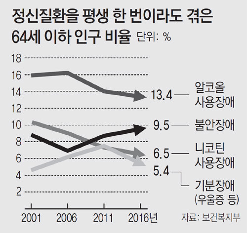 보건복지부가 지난해 5102명을 대상으로 17개 정신질환 실태를 조사한 결과 평생 한 번이라도 정신질환을 앓은 64세 이하 성인의 비율인 평생 유병률은 5년 전보다 0.8%포인트 줄어든 26.6%로 나타났다. 복지부는 ‘정신병자’라는 낙인이 두려워 병원을 찾지 않는 숨은 환자의 규모를 파악하기 위해 2001년부터 5년마다 이 같은 실태조사를 해오고 있다.