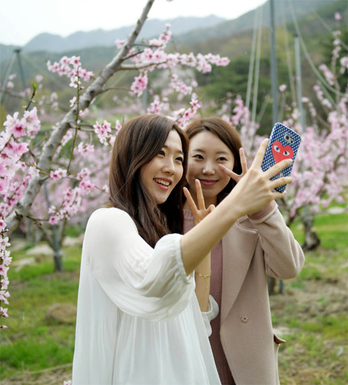 23일 대구 동구 팔공산 용진마을을 찾은 여성들이 복사꽃을 배경으로 사진을 찍고 있다.