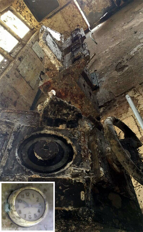 26일 세월호 선체조사위원회 측은 전남 목포신항에 거치된 세월호 조타실에 처음으로 진입했다. 조타기와 통신장비 등은 녹슬고 진흙으로 뒤덮여 형체를 알아보기 힘들다. 전기로 움직이는 조타실 내 벽시계는 참사 당일 세월호 선체가 108도로 급속히 기울던 시간과 겹치는 10시 17분 12초에서 멈췄다(왼쪽 아래 작은 사진).