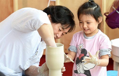 26일 경기 광주시 곤지암도자공원에서 열린 제20회 광주 왕실도자기 축제에 온 어린이가 물레를 돌려 도자기를 만드는 체험을 하며 웃고 있다. 이번 축제는 다음 달 7일까지 열린다. 광주시 제공