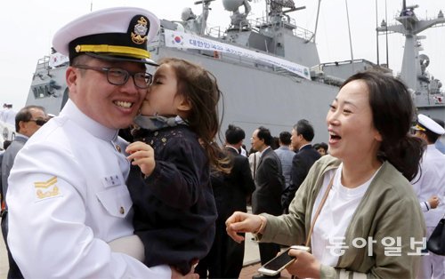 2일 청해부대 24진 장병들이 부산해군작전기지에서 대조영함에 승선하기에 앞서 가족들과 인사를 나누고 있다. 이들은 11월 말까지 소말리아 아덴 만 해역에서 해적 퇴치, 선박 호송 등의 임무를 수행한다.