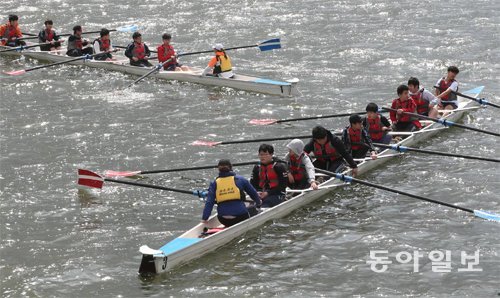 10일 오전 서울 마포구 망원한강공원에서 열린 ‘조정체험 아카데미’에 참여한 경성중학교 학생들이 노를 젓고 있다. 마포구가 조정교육 전문기관인 로잉코리아와 진행하는 이 아카데미는 30일까지 진행된다.