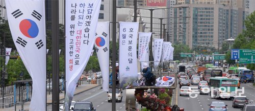 6월 호국보훈의 달을 하루 앞둔 31일 서울 송파구 올림픽로에서 구 관계자들이 순국선열의 넋을 기리는 내용의 배너와 태극기를 가로등에 걸고 있다.