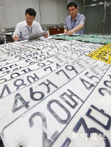 7일 서울 마포구청 징수과 직원들이 과태료 등을 체납해 압류된 차량의 번호판을 정리하고 있다. ‘전국 상습체납 차량 번호판 일제 영치의 날’을 맞아 전국 243개 기초자치단체에서 동시에 자동차세 등 차량 관련 과태료를 1회 이상 체납한 차량을 단속했다.