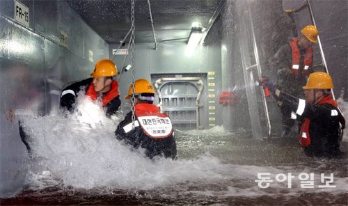 8일 경남 창원시 진해구 해군기지 내 손상통제교육장에서 해군 8전투훈련단이 적의 어뢰 공격으로 함정이 침수되는 상황을 가정해 피해를 복구하는 훈련을 하고 있다.