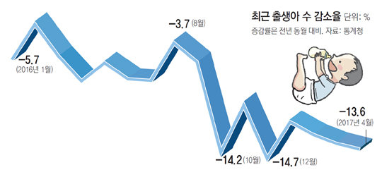 한국은 2015년 12월 이후 17개월 연속 전년 동월 대비 출생아 수가 줄었다. 특히 지난해 12월(―14.7%), 올해 1월(―11.1%), 2월(―12.3%), 3월(―13.1%), 4월(―13.6%) 등 5개월 연속 두 자릿수 감소율을 나타냈다. 지난해 12월에는 출생아 수가 2만7200명에 그치며 2000년 통계 작성 이후 월간 최저치를 찍었다.